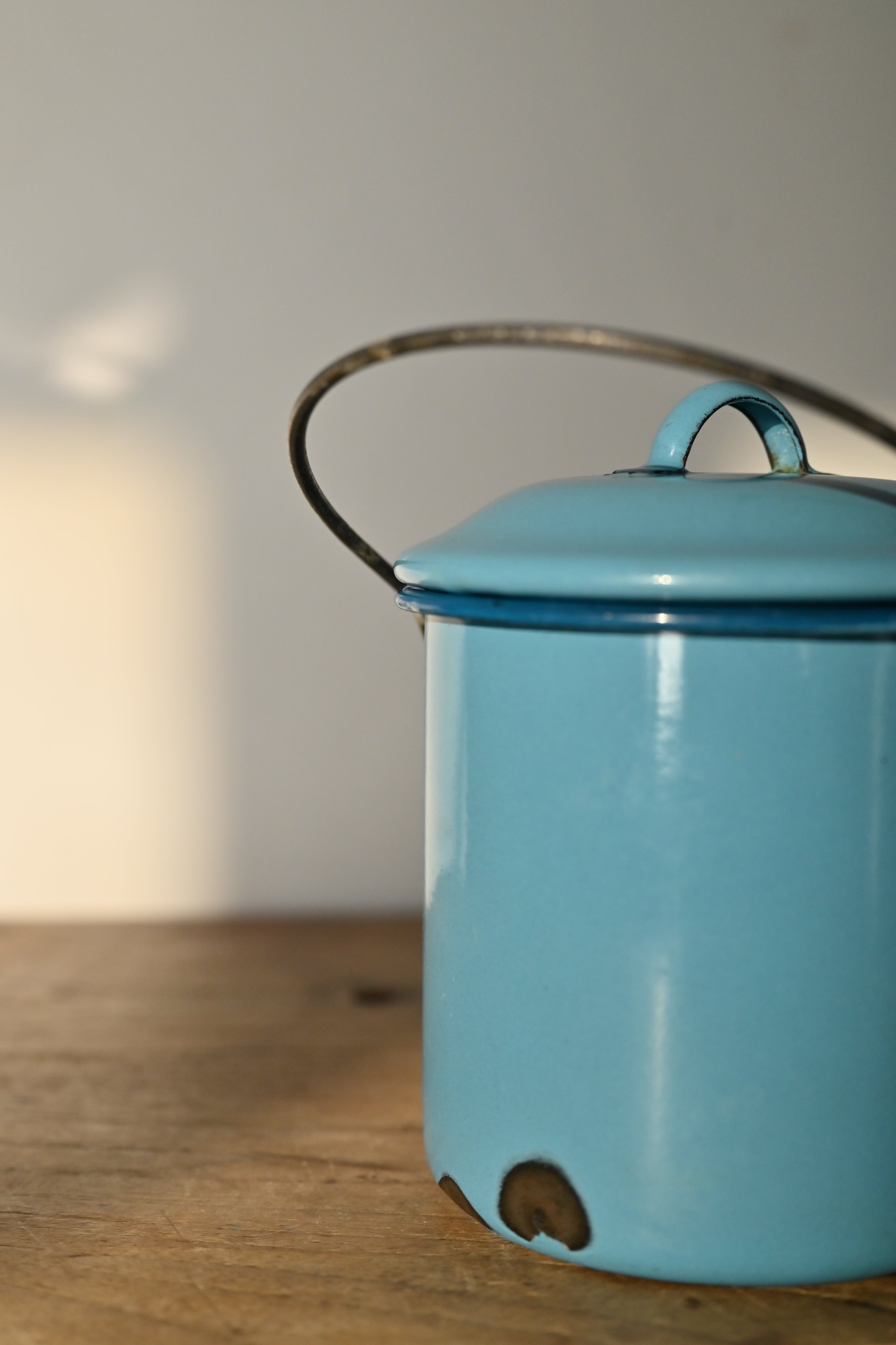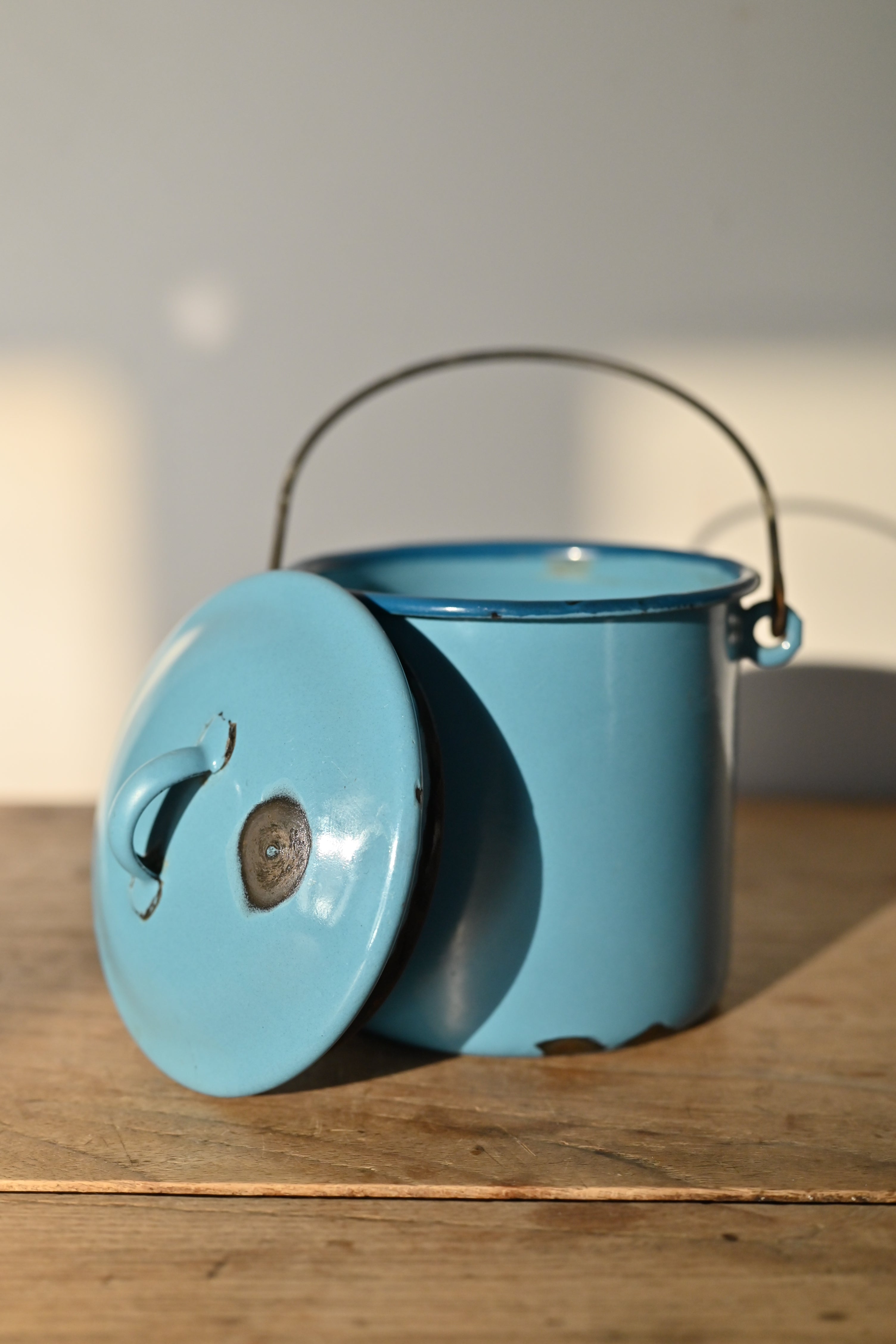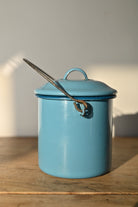 This dome lidded vintage enamel container is perfect for keeping salt close to hand while you cook. As a genuine vintage item, it comes with character marks and the perfectly imperfect patina that only time can create. It is blue, the colour of the sky of a perfect summer’s day.